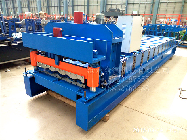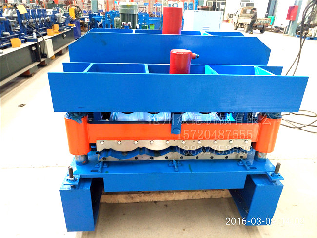 全自动828琉璃瓦彩钢压瓦机,该机器设备主要由装料架,装料架支座,进料导入平台,校平装置,压型主机,定型装置,成型剪切装置,液压泵站,全数控电脑自动控制柜等几部分组成. 机器简介:828琉璃瓦压型机的压型辊轮采用Cr12材质,经机床精车、精磨、镀硬络处理后,达58-62度,该压型机械压辊轮均采用精工数控车轮旋转成型,成型效果好,减少轮子和原材料之间的摩擦力,调试方便、,机器的任何零部件均采用配置,为的是机器的质量,压板平整,使用寿命长!