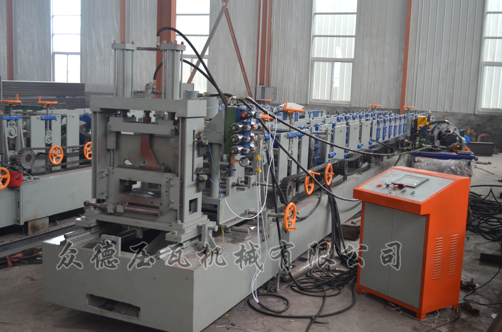 描述:全自动C型钢机是一套可生产多种规格C型檩条成品的单卷成型机组。常用规格是80-300,该机主要由被动装料架、整平装置、冲孔装置、成型后切断装置、液压站、电脑控制系统等。本机