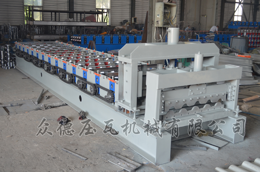 描述:竹筒琉璃瓦机分为三部分,辊道成型部分,压型部分,切刀部分。辊道成型部分是由电机拖动,链条带动各辊转动。压型部分是液压缸带动模具上下移动,可以把彩钢压成许多节,形似琉璃瓦。